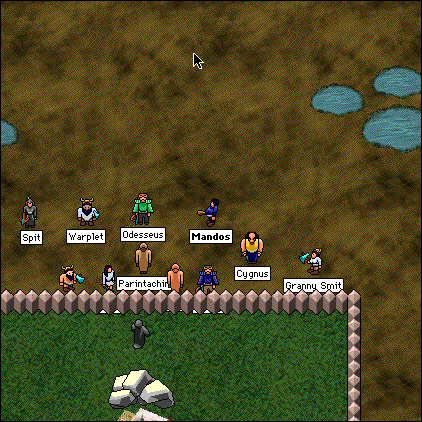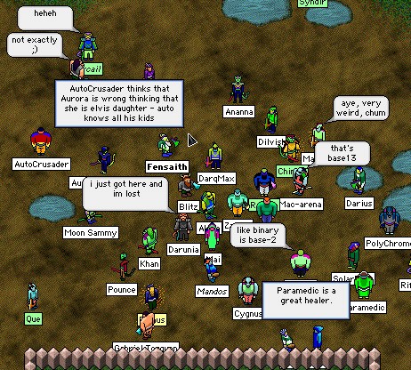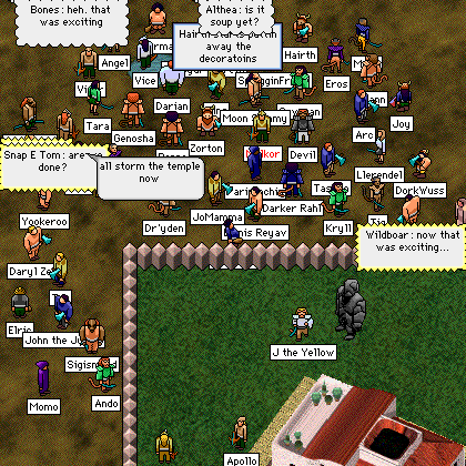 Here we have a "load test," where they promised free ranks to get as many people online at the same time as possible. Some interesting things to note, including Joy's axe, and Malkor's nametag... he only became respectable quite recently. ;>