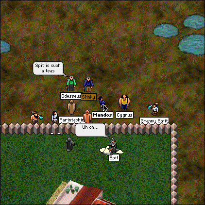 Spit obliged and got dragged under the earth. Spit and I actually became pretty good friends around that time, and after I beat her a few times in the arena (both of us were healers) I taught her how to fight. She eventually became famous for being able to defeat JoMamma, I believe.